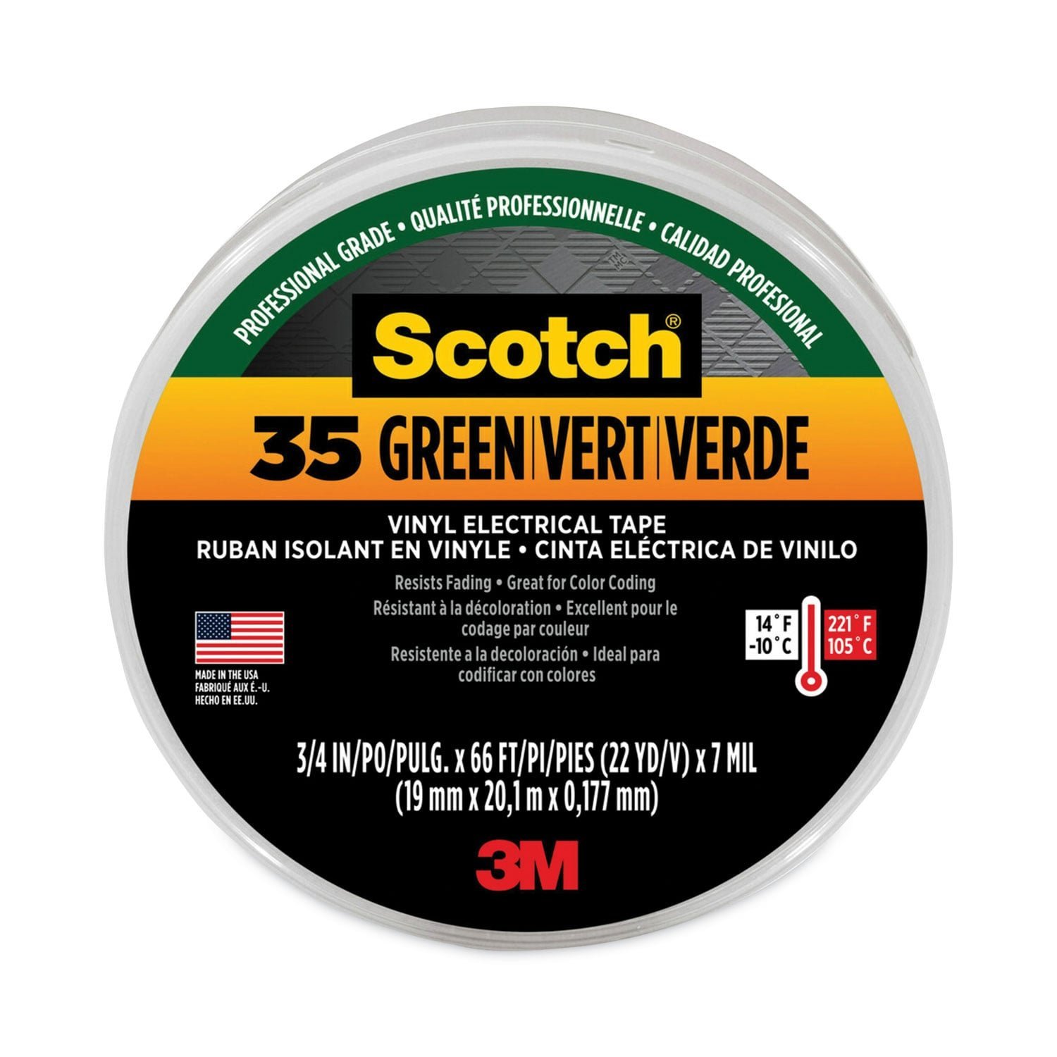3M Scotch 35 Vinyl Electrical Color Coding Tape, 3″ Core, 0.75″ x 66 ft, Green (10851)