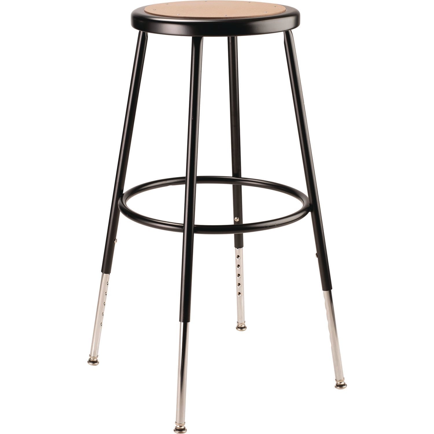 The durable construction and classic design of the 6200 Series heavy-duty stools are ideal for hands-on educational settings like art rooms, science labs, home economics or shop classrooms. Handy height-adjustable legs. These reliable stools feature a sturdy frame of 18-gauge steel tubing securely welded to a 14″ diameter seat pan. Riveted to the pan are firm, round Masonite seats that will not warp, chip or crack as they provide years of dependable use. Footrest rings are securely bonded to each leg with four spotwell contact points. Recommended Application Area(s): Classroom & Training; General Office & Task; Healthcare; Seat Color: Brown; Color Family: Black; Arms Included: No.