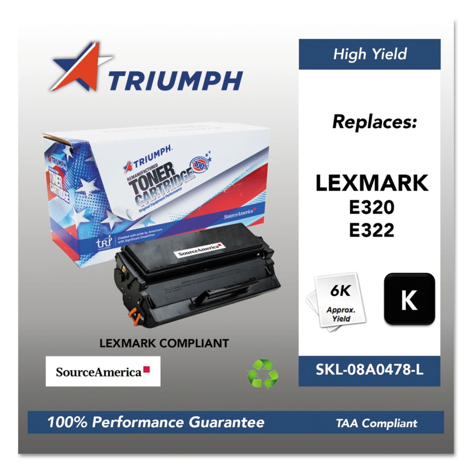 Remanufactured toner cartridge. Source America is the preferred brand of federal purchasers worldwide dueto a strong performance history of reliability, value, sustainability and mission. Source America toner provides strategic opportunities to address a variety of customer needs including: significant savings, guaranteedperformance, compliance with executive orders and free recycling solutions. Plus, every purchase creates jobs for people who are blind or have significant disabilitiesincluding wounded warriors. Device Types: Multifunction Laser Printer; Color(s): Black; Page-Yield: 6,000; Supply Type: Toner.