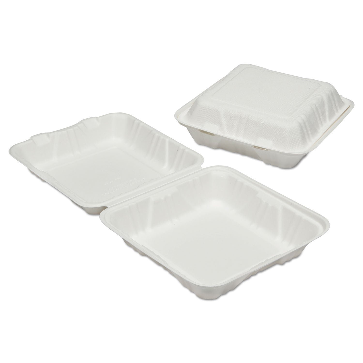 Bio-based pulp food containers with hinged lids and secure closures are ideal for transporting and storing hot or cold foods. Square microwaveable containers have high insulation qualities yet resist grease. Food Container Type: Hinged Lid Container; Material(s): Wood Pulp Paper; Food Container Material Type: Paper; Color(s): White.