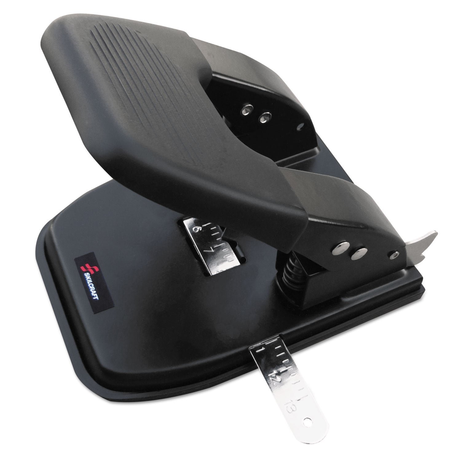 Two-hole punch features a protective rubber base that prevents work surface scratches and sliding. Spring-loaded handle reduces punching effort. This standard-duty device punches round holes, spaced 2 3/4″ apart. An adjustable paper guide locks at common paper sizes. Adjustable. Sheet Capacity: 30; Operating Method: Manual; Number of Holes: 2; Hole Diameter: 1/4″.