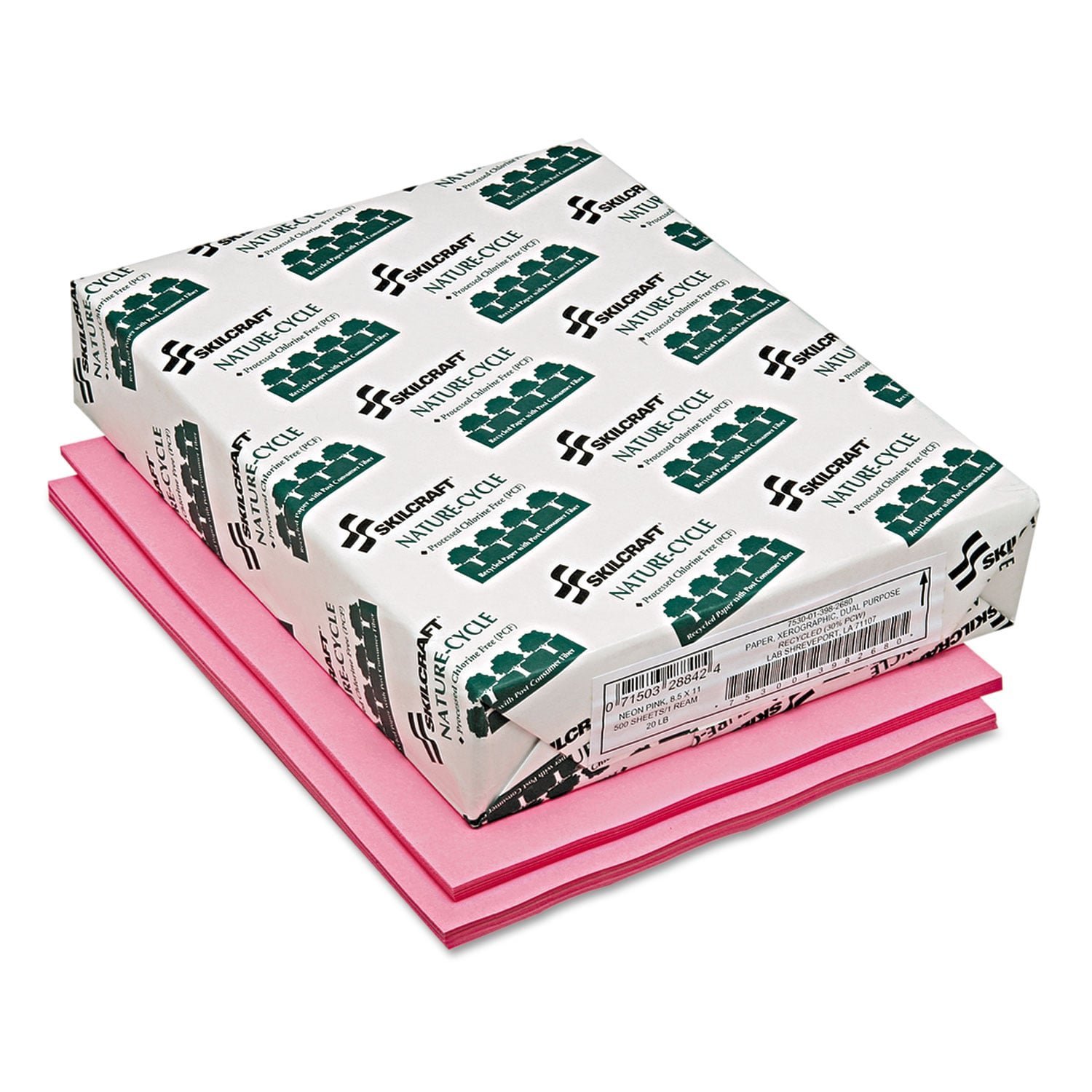 Manufactured using 100% chlorine-free processing. Brightly colored to make your documents stand out. Paper is made using recycled materials. Sheet/Roll Size: 8.5 x 11; Paper Basis Weight (lb): 20 lb Bond; Paper/Media Color(s): Neon Pink; Color Family: Pink.