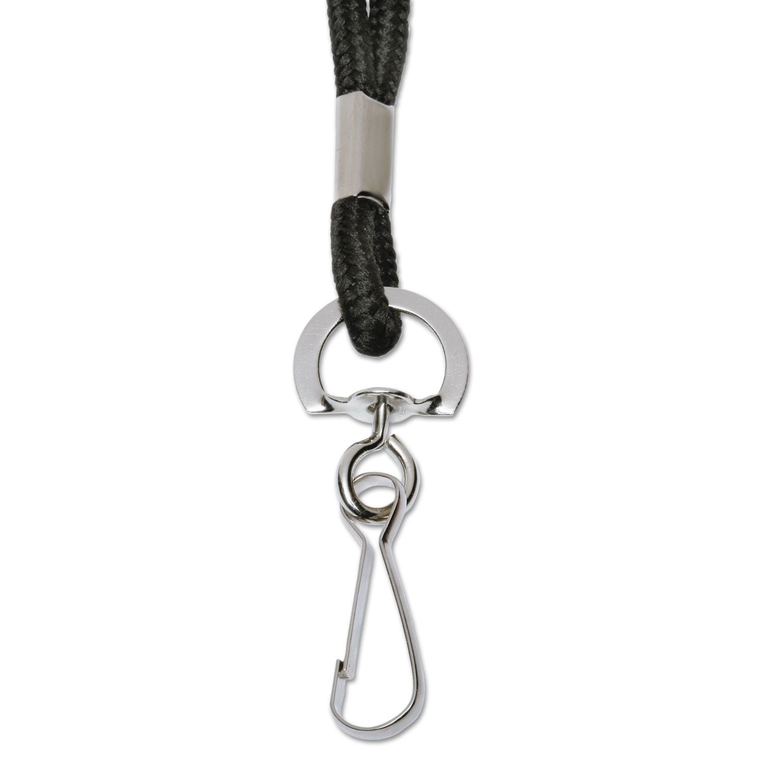 Neck lanyards with J-hook attachment. The perfect way to display your identification without attaching to clothing. Comes with a slide adjuster, side release buckle for easy detachment, and a comfortable safety breakaway. Round Polyester Cord Lanyard. Fastener Style: J-Hook; Lanyard Color(s): Black; Length: 36″; Safety Breakaway Connector: Yes.