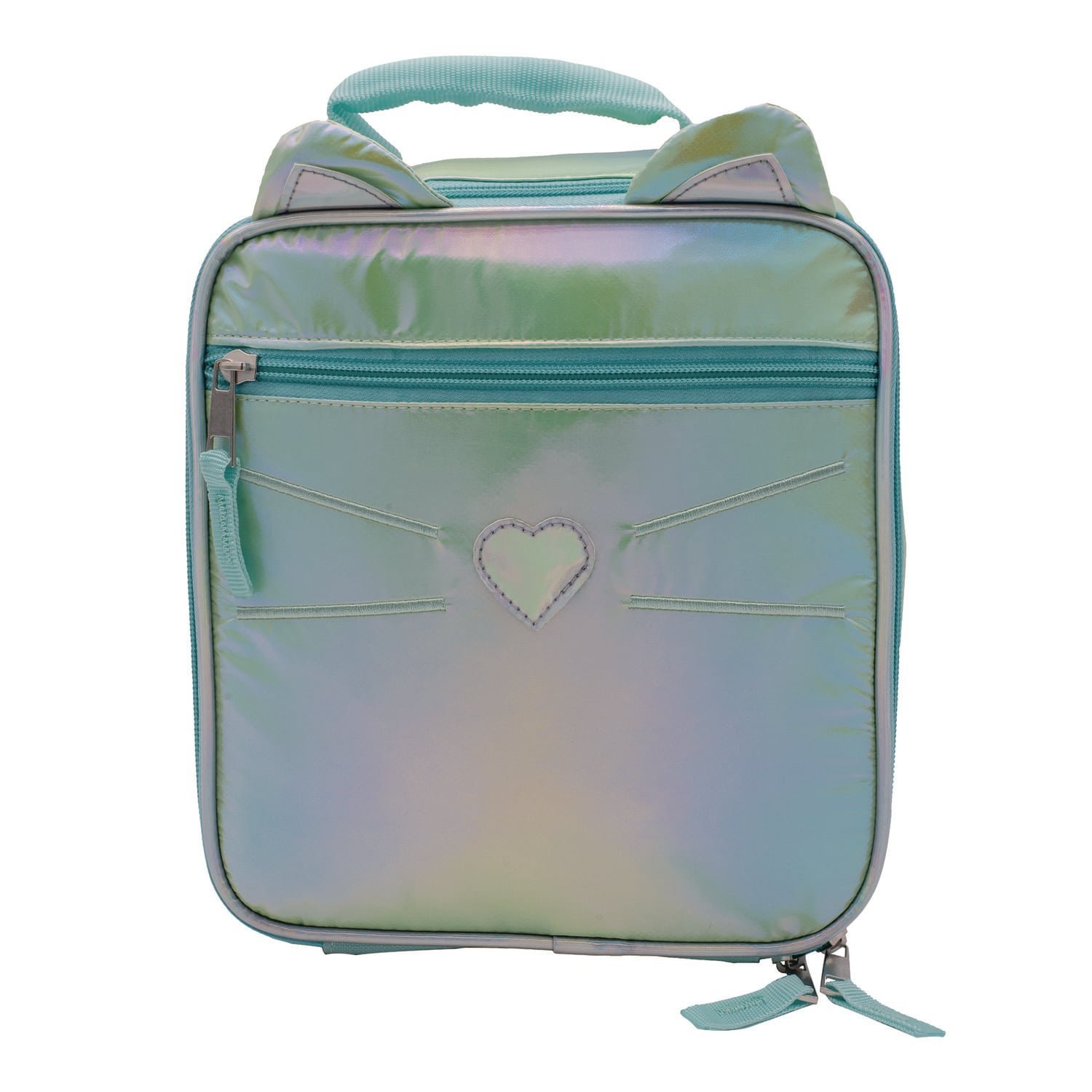 This Accessory Innovations lunch bag is perfect for back to school and beyond. This super cute lunch bag is made of iridescent poly nylon with 3D ears, PU nose applique, and embroidered whiskers. The bag has a large zip-closure main compartment with plenty of room for sandwiches, drinks, snacks, etc. Color(s): Aqua; Color Family: Blue; Material(s): Nylon; Carrying Handle: Yes.