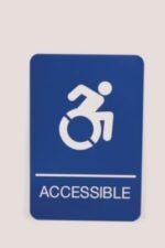 Universally and easily recognizable white graphics. Raised tactile graphics with Grade 2 Braille. Meets Americans with Disabilities Act (ADA) requirements. Includes double-side adhesive tape for mounting to door or wall. Size: 6″ x 9″; Message(s): Accessible; Material(s): Injection Molded Rigid Plastic; Orientation: Vertical.