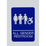 Universally and easily recognizable white graphics. Raised tactile graphics with Grade 2 Braille. Meets Americans with Disabilities Act (ADA) requirements. Includes double-side adhesive tape for mounting to door or wall. Size: 6″ x 9″; Message(s): All Gender Restroom; Material(s): Injection Molded Rigid Plastic; Orientation: Vertical.