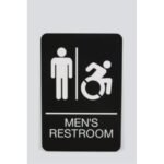Universally and easily recognizable white graphics. Raised tactile graphics with Grade 2 Braille. Meets Americans with Disabilities Act (ADA) requirements. Includes double-side adhesive tape for mounting to door or wall. Size: 6″ x 9″; Message(s): Men’s Restroom; Material(s): Injection Molded Rigid Plastic; Orientation: Vertical.