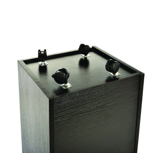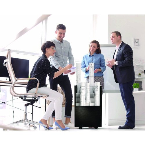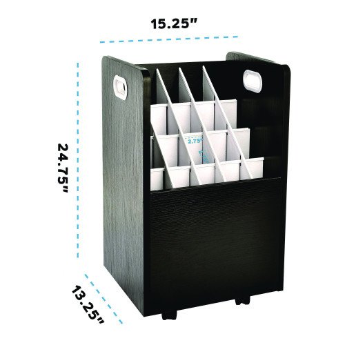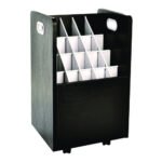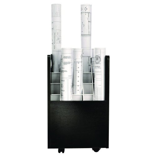 No matter how elaborates your current work-in-progress is, there’s an efficient storage solution for keeping it organized. The AdirOffice Mobile Wood Blueprint Roll File holds your rolled blueprints, plan drawings, maps and other large-format documents snugly in square compartments, making it the perfect organizational solution. Sturdy and visually appealing, the unit is expertly crafted using durable wood composite to provide long-lasting strength and use for many years to come. It’s furnished in laminate that will seamlessly complement any existing decor and boasts a 50 lb weight capacity to hold all of your rolled files in one convenient place. The bottom of the cabinet is outfitted with four swiveling casters to facilitate easy movement of your documents, while side handles make it easy to hold and transport the unit from one location to the next. Color(s): Black; Number of Compartments: 20; Overall Width: 15.25″; Overall Depth: 13.25″.