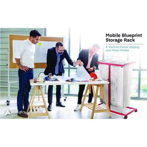 Get organized in the office with the AdirOffice Mobile Vertical Plan Center for Blueprints. For quick access, hanging blueprint storage, just clamp your files into hanging paper clamps and drop them into the top bracket. Designed for blueprints, maps and other large-format documents. Made of solid steel with a 240 lb weight capacity, this rack can hold up to 1,200 documents at once. With its durable construction and powder-coated finish, you can be certain that it will provide long-lasting strength and use throughout the years. For added convenience, this blueprint rack accommodates your largest files. The bracket accommodates 12 clamps and can be adjusted to fit paper clamps that are 36″. Only one size of hanging clamps can be placed into this mobile blueprint stand at a time. An ingenious solution to the difficulties of moving documents, this mobile plan center works equally well in harsh environments such as construction sites and soft settings such as modern offices. It glides easily across spaces on its four swivel casters, two of which brake for control of movement and to keep it stable when you get to your destination. Color(s): Red; Rack Style: Blueprint Literature Rack Display; Mounting: Freestanding; Document Size Accommodation: Assorted.