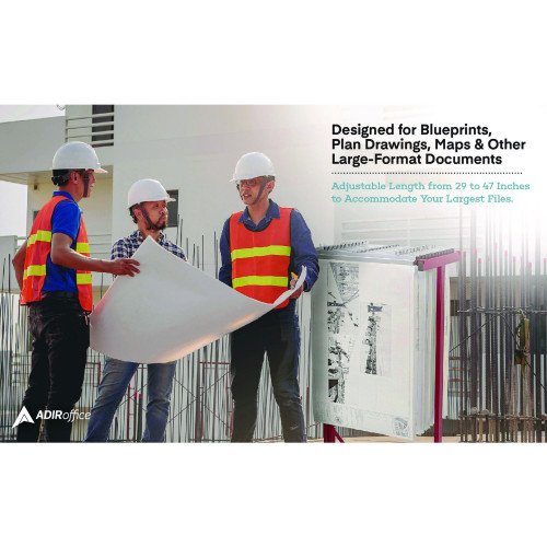 Stay organized and efficient in the office with the AdirOffice Expandable Mobile Plan Center for Blueprints. For quick access, hanging blueprint storage, just clamp your files into hanging paper clamps and drop them into the top bracket. Designed for blueprints, plan drawings, maps and other large-format documents. Made of heavy-gauge steel with a 360 lb weight capacity, this rack can hold up to 1,800 documents at once. With its durable construction and powder-coated finish, you can be certain that it will provide long-lasting strength and use for years to come. For added convenience, this blueprint rack is adjustable to accommodate your largest files. The bracket accommodates 18 clamps and can be adjusted to fit paper clamps that are 24″, 30″, 36″ or 42″. Only one size of hanging clamps can be placed into this mobile blueprint stand at any one time. An ingenious solution to the difficulties of moving documents, this mobile plan center works equally well in harsh environments, such as construction sites, and soft settings, such as modern offices. Four swivel casters, two of which brake for control of movement and to keep the rack stable when you get to your destination, let you move this much weight with ease. Color(s): Red; Rack Style: Blueprint Literature Rack Display; Mounting: Freestanding; Document Size Accommodation: Assorted.