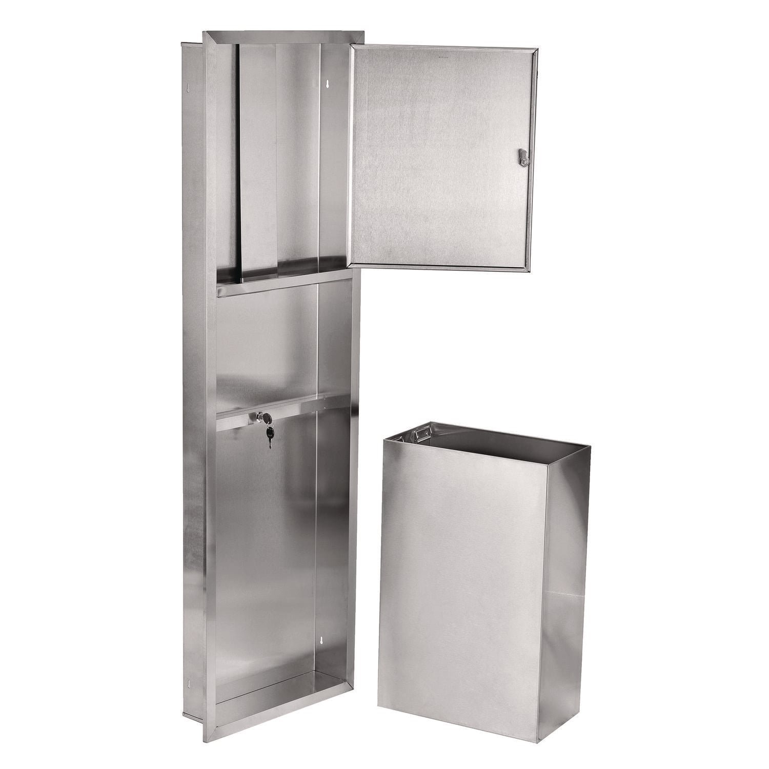 Our Recessed Paper Towel Dispenser and Waste Receptacle is made from long-lasting, heavy gauge stainless steel with a smooth satin finish. With our self-feeding, rounded hemmed opening, paper towels dispense without tearing, limiting waste. The paper towel tray can hold 600 C-Fold or 800 Multifold paper towels. Our waste receptacle features an ample sized leakproof 12-gallon waste container that is ideal for high traffic areas such as public bathrooms. Inside the wastebasket is two stainless steel clips to ensure the trash bag is secure throughout the day. Each door is furnished with a tumbler lock key to prevent any unauthorized access. Towels Dispensers Type: Folded Towel Dispenser; Dispenser Capacity (text): 600 C-Fold; 800 Multifold; Material(s): Stainless Steel 304; Color(s): Stainless Steel.