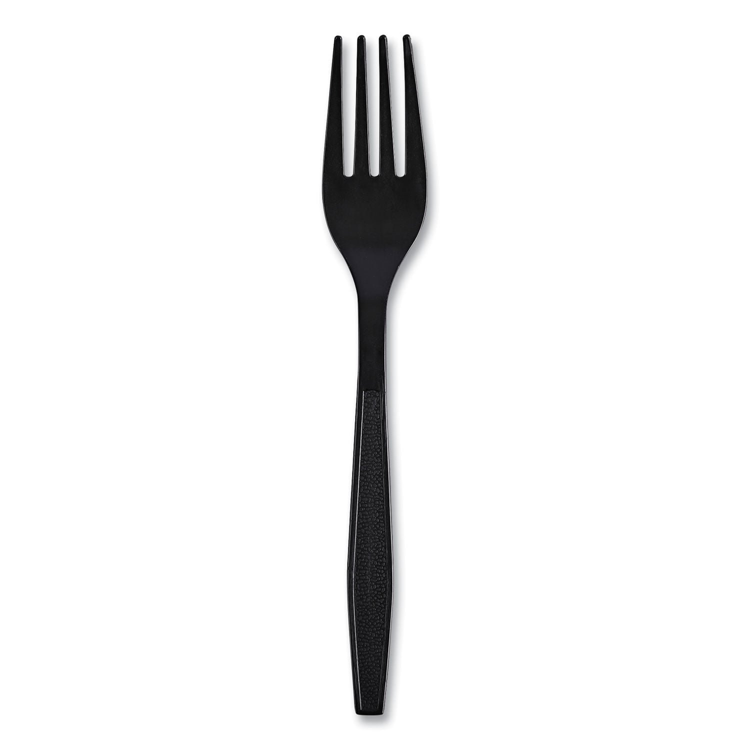 A great option for virtually any dining environment, heavyweight, wrapped cutlery items offer quick event set-up or packing for to-go meals. Individually packaged for convenience and to ensure utensils remain sanitary, even after handling. The high-quality utensils have the versatility to be used with nearly any cuisine, making them an ideal fit for takeout, concession stands, cafeterias, offices, and special events. Utensils Type: Fork; Material(s): Polypropylene; Color(s): Black; Grade: Heavyweight.