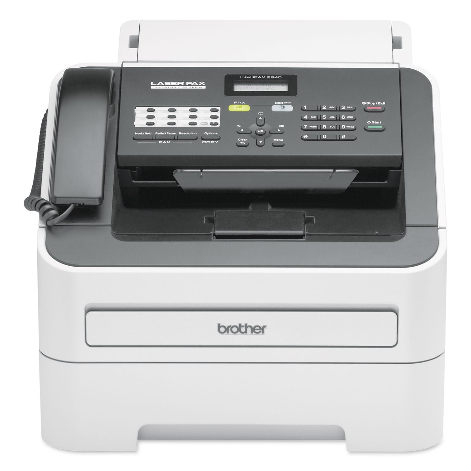 IntelliFAX-2840 laser fax is ideal for home offices or small offices. It features a 33.6 kbps modem, 16 MB memory and a 20-page capacity auto document feeder for faxing and copying multiple pages. This compact fax offers 272 broadcasting locations, 200 speed dial locations, 22 one-touch keys and can even receive fax and voice calls on the same telephone line. It has a generous paper tray capacity of 250 sheets and a USB interface for future printing capability. Machine Functions: Copy; Fax; Print; Printer Type: Laser; Maximum Print Speed (Black): 21 ppm; Network Ready: No.