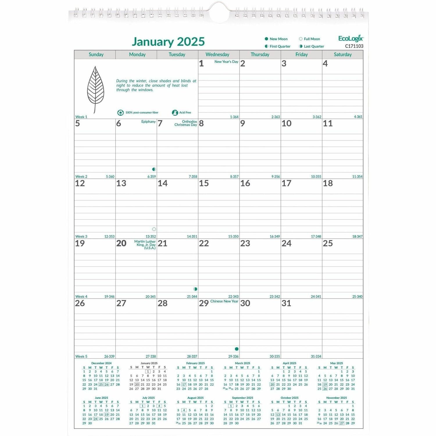 EcoLogix® is a complete line of planners and calendars made with 100% post-consumer recycled paper that contributes to saving the environment. Ecological tips are included to help consumers discover new ways of being eco-friendly.12 months, January to DecemberEcological tips on each page100% post-consumer recycled paper, 90% recycled metalOne month per sheet, one block per dayCountdown of days passed and days to come, highlights holidays and phases of the moonYearly calendar at the bottom of each sheetTwin-wire binding with eyelet to suspendReinforced chipboard backerFSC® CertifiedSize: 12″” x 17″”English