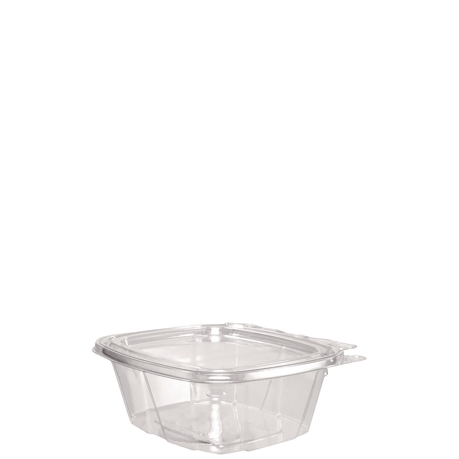 Made of PET, ClearPacSafeSeal containers are specifically designed to inhibit tampering, eliminating the need for shrink bands and wrap labels. TheTamperAlertHingeprotrudes outward when torn, alerting the customer that the container has been opened. The hinge remains attached to the container, for no loose plastic pieces. ClearPac SafeSeal containers function as an easy to re-close and re-open, leak resistant two-piece container once the hinge is torn. Features exceptional performance in cold temperatures and accommodates freezing down to -22F. Flat lid. Food Container Type: Hinged Lid Container; Material(s): PET – Polyethylene Terephthalate; Food Container Material Type: Plastic; Capacity (Volume): 16 oz.