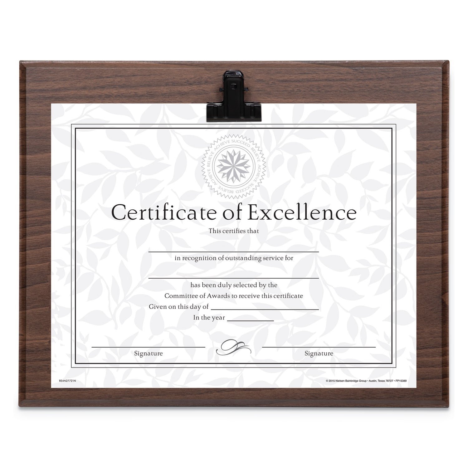 This document plaque includes a decorative clip on the front to display your achievements, awards or photos. Hang it on the wall or display on desktop for a modern style and personalized look. For wall or desktop display. Usable certificate included. Frame Type: Certificate/Document; Frame Material: Wood; Frame Color: Walnut; Color Family: Walnut.