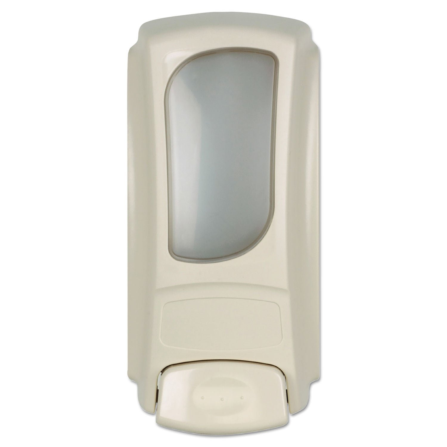 Durable, attractive push-type dispensers are a sleek and convenient option for any gym or spa. Unique non-corrosive key and locking mechanism helps prevent tampering and vandalism. Large reservoir holds enough for at least 15 showers, minimizing the need for refills. Convenient dispensers ensure that no product is wasted and provide easy, uninterrupted service to patrons. Designed to work with Dial Eco-Smart amenity refills (sold separately). Install one, two or three dispensers according to your needs – these dispensers interlock to create an attractive, uniform look. Dispenser Type: For Liquids; Capacity (Volume): 15 oz; Mounting: Wall; Material(s): Plastic.