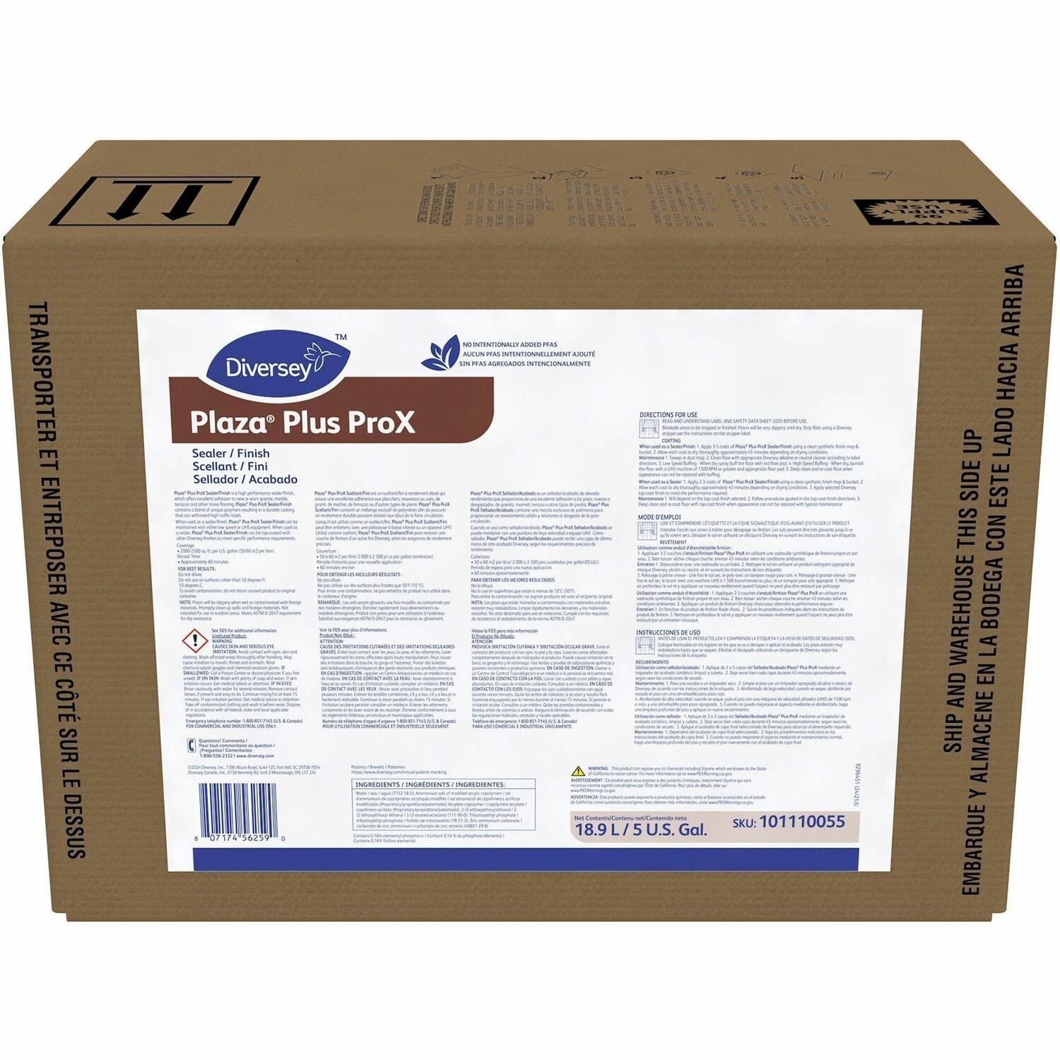 Plaza Plus Sealer/Finish is a long-lasting, high-gloss sealer/finish specifically formulated for stone floors. You can use it on terrazzo, quarry tile, brick, slate, granite, marble, unglazed ceramic and Mexican tile. It seals and finishes, can be applied, maintained and removed like any conventional finish. Ready-to-use sealer/finish offers excellent adhesion to new or worn stone flooring. Exhibiting exceptional gloss, leveling and long-lasting durability, it is easy to maintain in conventional and UHS programs. Sealer/finish does not contain any intentionally added PFAS (Perfluoroalkyl and Polyfluoroalkyl substances).
