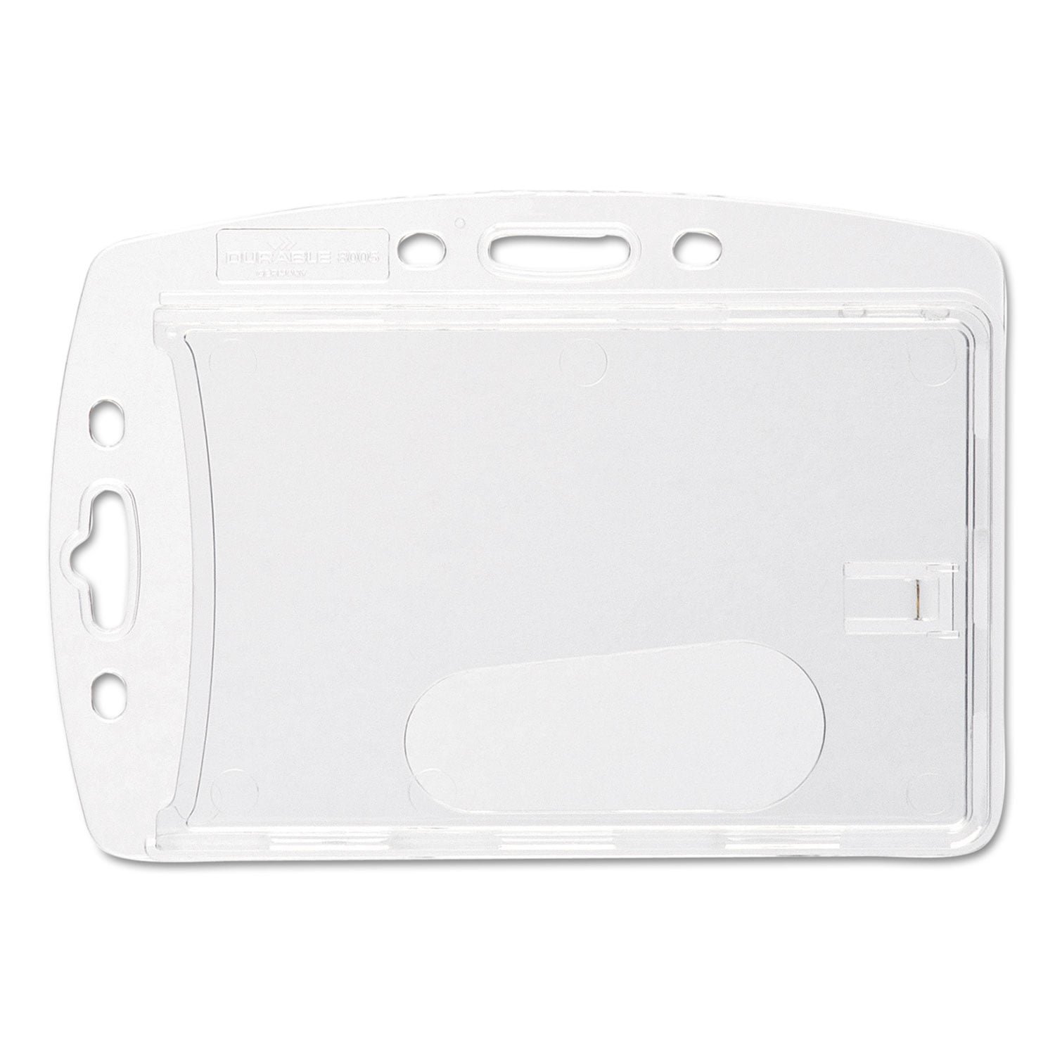 Replacement card holders for use with Durable ID/security badge holder sets. Can be used vertically or horizontally. Orientation: Horizontal/Vertical; Name Badge Holder Length: 2.13″; Name Badge Holder Width: 3.38″; Name Badge Holder Color(s): Clear.