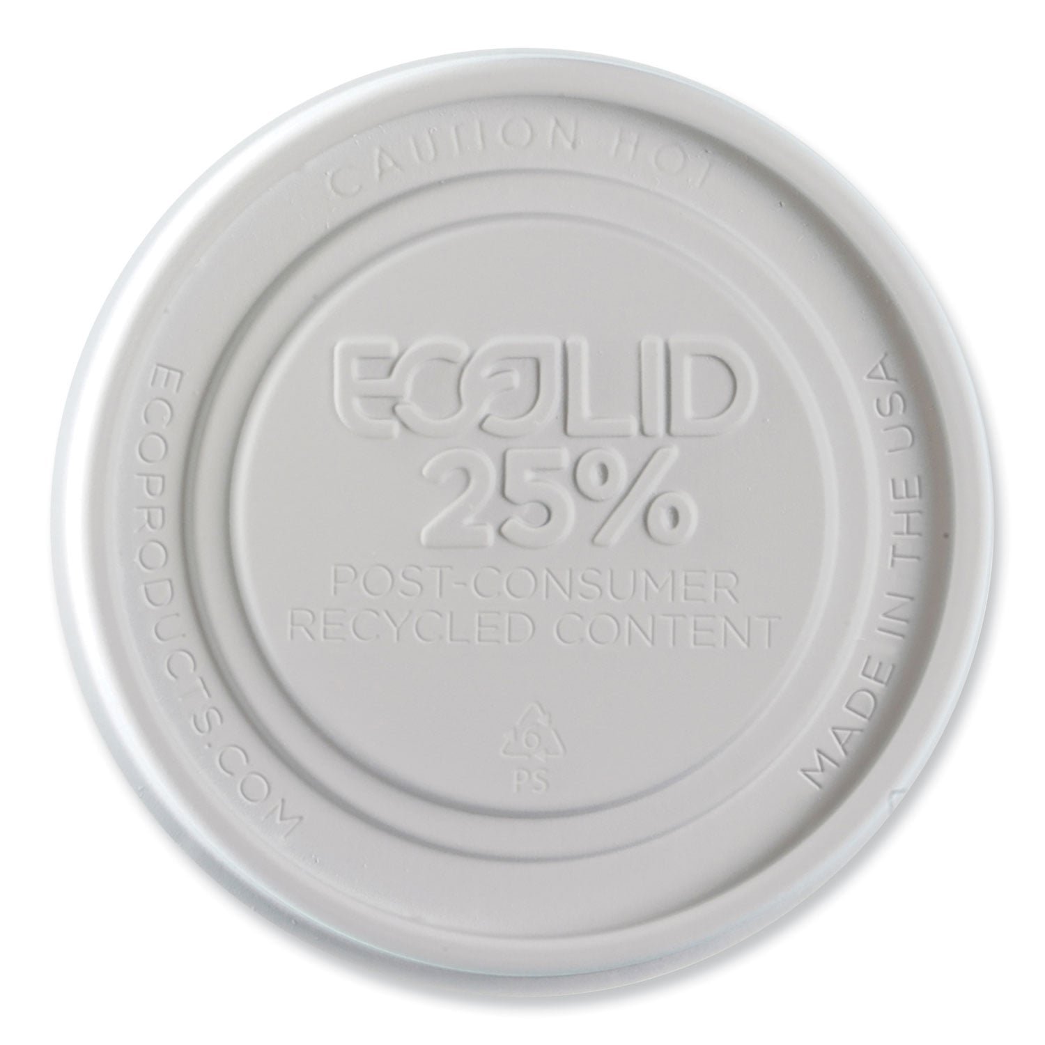 A one-of-a-kind food container lid made from recycled polystyrene. The EcoLid 25 is an industry-first, recycled content solution that can help keep waste out of landfills. Performs just like traditional plastic. Used for keeping food hot and locking in freshness. Food Container Type: Lid; Material(s): Polystyrene; Color(s): White; Hinged Lid (Yes/No): No.