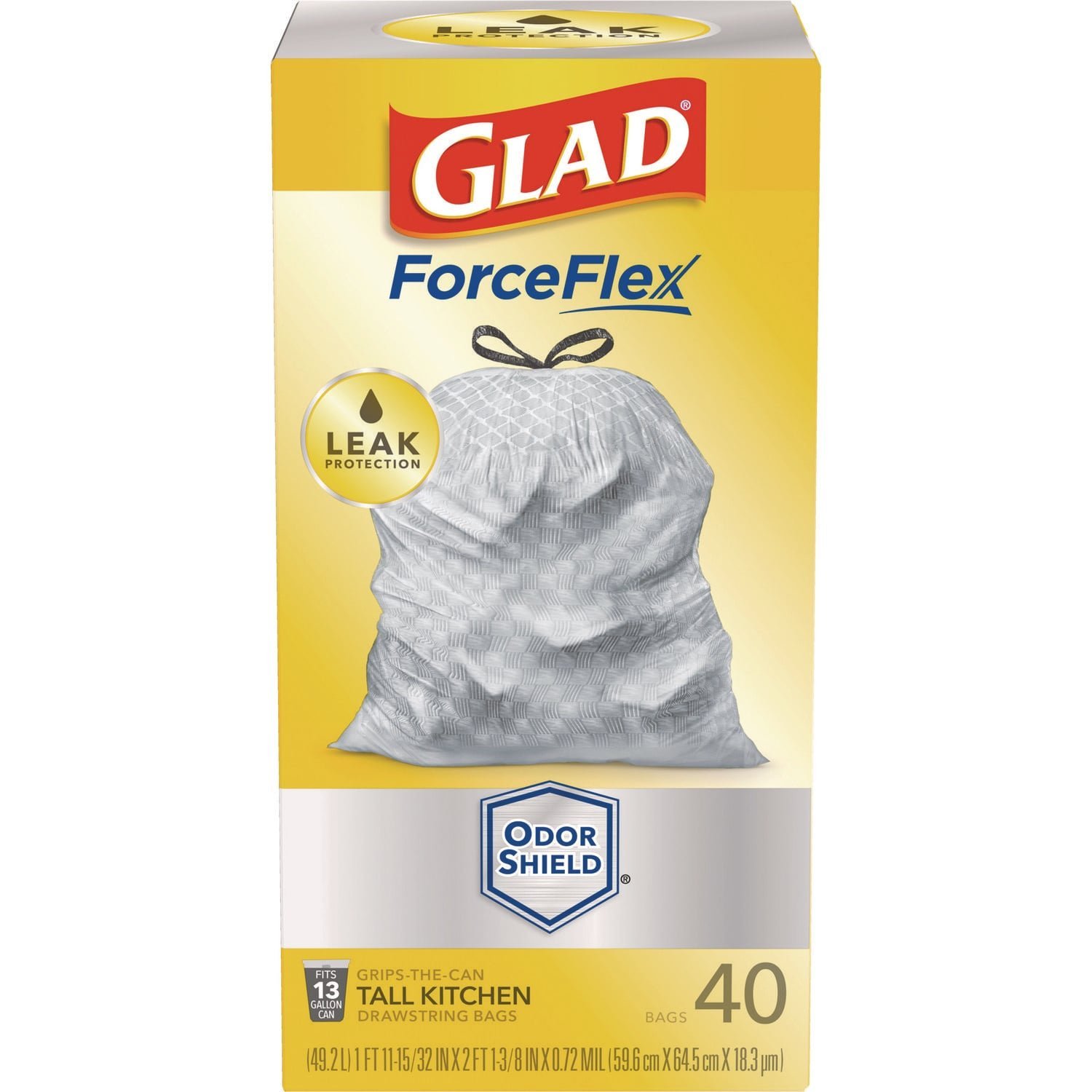 Fight nasty kitchen odors with Glad trash bags. Glad Tall Kitchen Drawstring Trash Bags are designed with ForceFlex technology to give extra flex as it expands around sharp edges and heavy loads, so you can pack it in while resisting tears, rips and punctures. These bags keep your kitchen pleasantly fresh smelling with long lasting odor control. Let the stretchable strength of Glad handle all the messes our busy daily life can throw at it and then some. With double-sided seals and a reinforced bottom, these bags are designed with RipGuard and LeakGuard technology to prevent seepage of liquids and keep trash contained. The durable Grips-The-Can Drawstring ensures a tight grip on the trash can to keep it in place. Take the trash to the curb with no fear of leaks and tears, and no frustration. Keep your kitchen smelling clean with the stretchable strength of Glad.Ideal for use in offices, schools, daycare centers, restaurants, hotels and other commercial facilities. Commercial/Consumer Use: Consumer Use; Maximum Volume Range: 11 to 15 gal; Maximum Volume Capacity: 13 gal; Waste Bag Thickness: 0.72 mil.