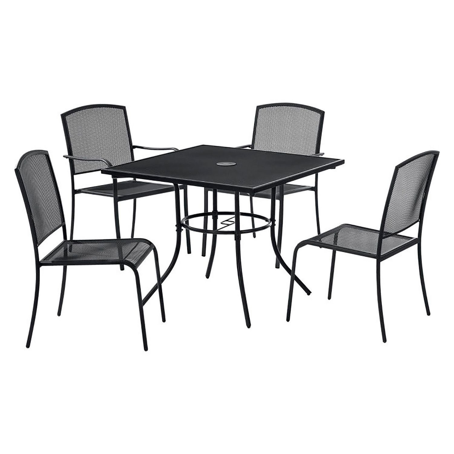 Give patrons or guests a new place to sit on your outdoor grounds. The Interion Outdoor Caf Table & Chair set is ideal for cafs, restaurants, lounges, patios, and a variety of other food service areas with outdoor dining locations. Made of commercial grade steel with a zinc rich black powder-coat finish to help prevent rust and corrosion. Top Color: Black; Color Family: Black; Base Color: Black; Top Shape: Square.