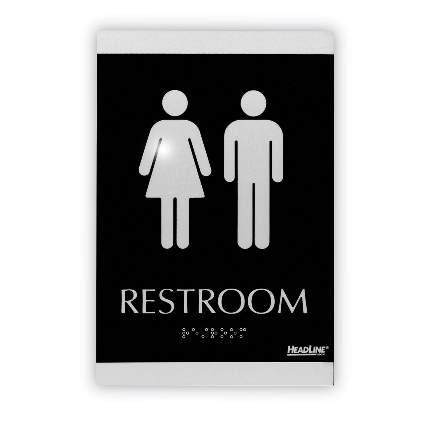 Universally and easily recognizable silver graphics. Raised tactile graphics with Grade 2 Braille. Meets Americans with Disabilities Act (ADA) requirements. Includes double-sided adhesive tape for mounting to door or wall. Frame Color: Black/Silver; Size: 6 x 9; Message(s): Restroom; Material(s): Heavy-Duty Plastic.