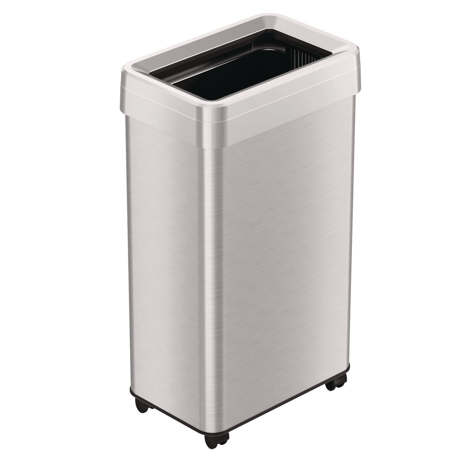 Upgrade your facility with our sleek and efficient open top trash cans, now featuring removable caster wheels for ultimate mobility and quick deployment! These bins are designed for swift and easy disposal with their convenient open top lids. Dual odor filters keep your surroundings fresh and clean, making them perfect for offices, hotels, government buildings, and hospitals. The durable stainless steel body and ABS plastic lid provide a stylish and long-lasting solution, while the slim, space-saving design integrates seamlessly into any professional setting. Enhance your space today with these practical, elegant, and mobile trash cans. Waste Receptacle Type: Indoor All-Purpose Waste Bin; Material(s): Plastic; Stainless Steel; Application: Indoor All-Purpose Waste Disposal; Interior Volume Capacity: 18 gal.