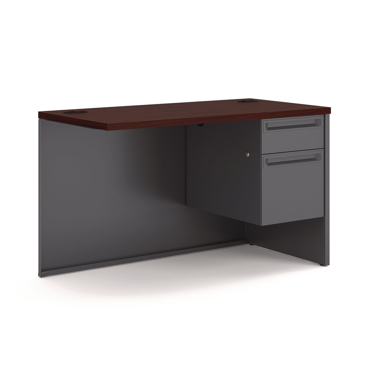 High-pressure laminate top is moisture-, scratch- and stain-resistant. Drawers operate on steel ball bearing slides. Tru-fit mitered drawers with a removable core lock. Cord management grommets and modesty panel. Not freestanding. Attach to single pedestal desk or L-workstation desk to create an L-workstation. Return Orientation: Right; Color(s): Mahogany/Charcoal; Color Family: Mahogany; Pedestal Count: 1.