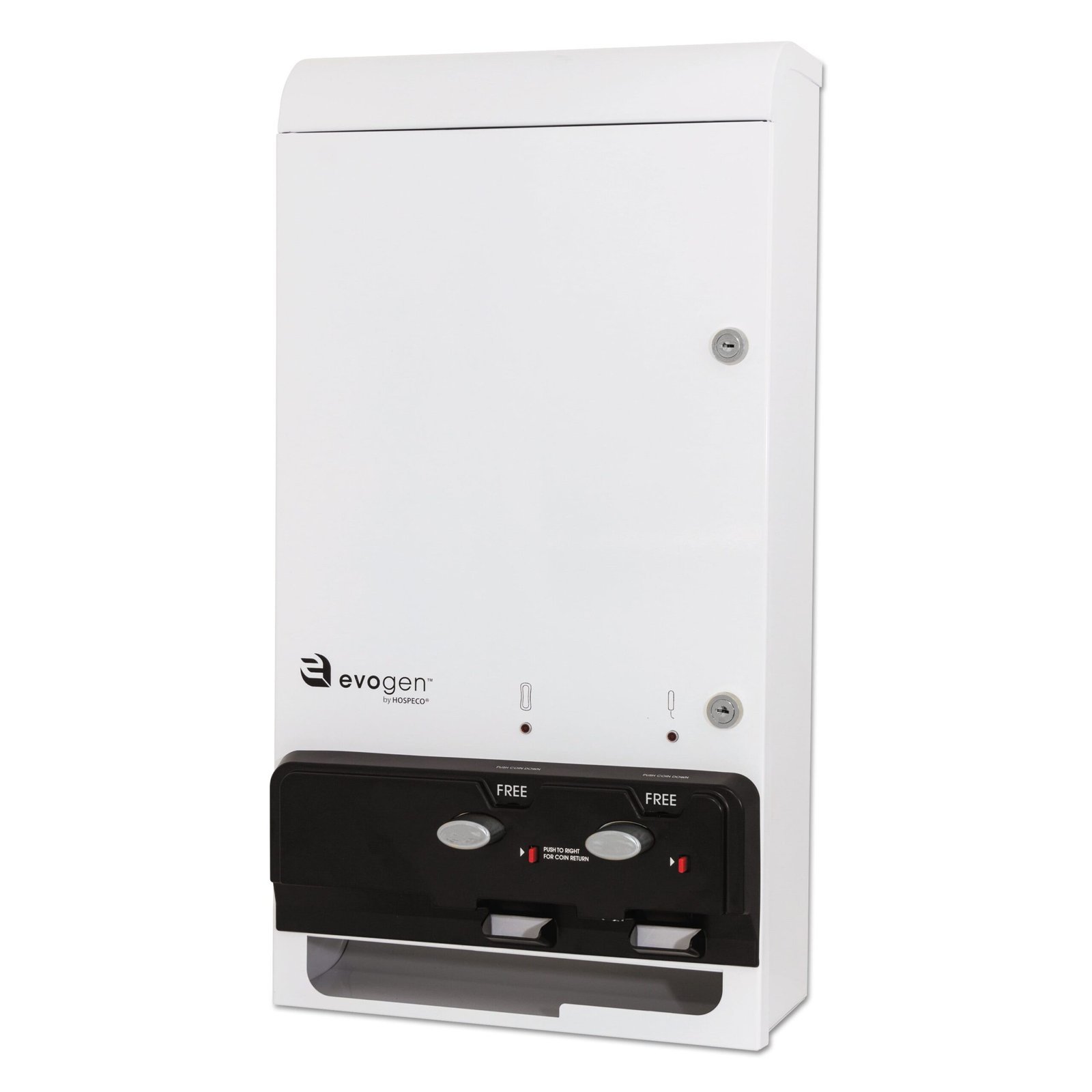 Evogen dispensers make stocking and dispensing more convenient than ever before. The modern streamlined styling is attractive and easy to use. Vends For FreeDelay mechanism between vends. Holds: 14 Napkins; 22 Tampons; Locking: Lock for Coin Box; Lock for Door; Material(s): Metal; Color(s): White/Black.