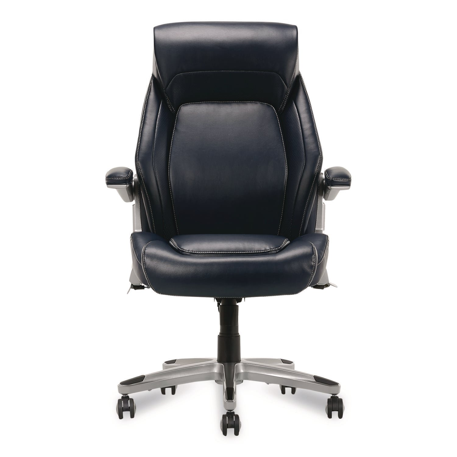 Upgrade your office space with the La-Z-Boy Meyer active lumbar executive office chair. True to La-Z-Boy’s commitment to innovation, it has the looks and comfort you would expect from a leading name in furniture, plus features that you need for long days in the office. The built-in lumbar panel changes shape based on your activity to give support while sitting and space when reclining. Automotive-inspired side bolsters are designed to provide lateral support to help ensure midline sitting and even weight distribution for optimal alignment. High-quality bonded leather upholstery offers a hint of sheen and smooth texture. Look no further than the La-Z-Boy Meyer active lumbar executive office chair for effortless good looks, superior ergonomics and quality that stands out above the rest. Recommended Application Area(s): Executive & Management; General Office & Task; Seat Color: Navy; Back Color: Navy; Color Family: Blue.