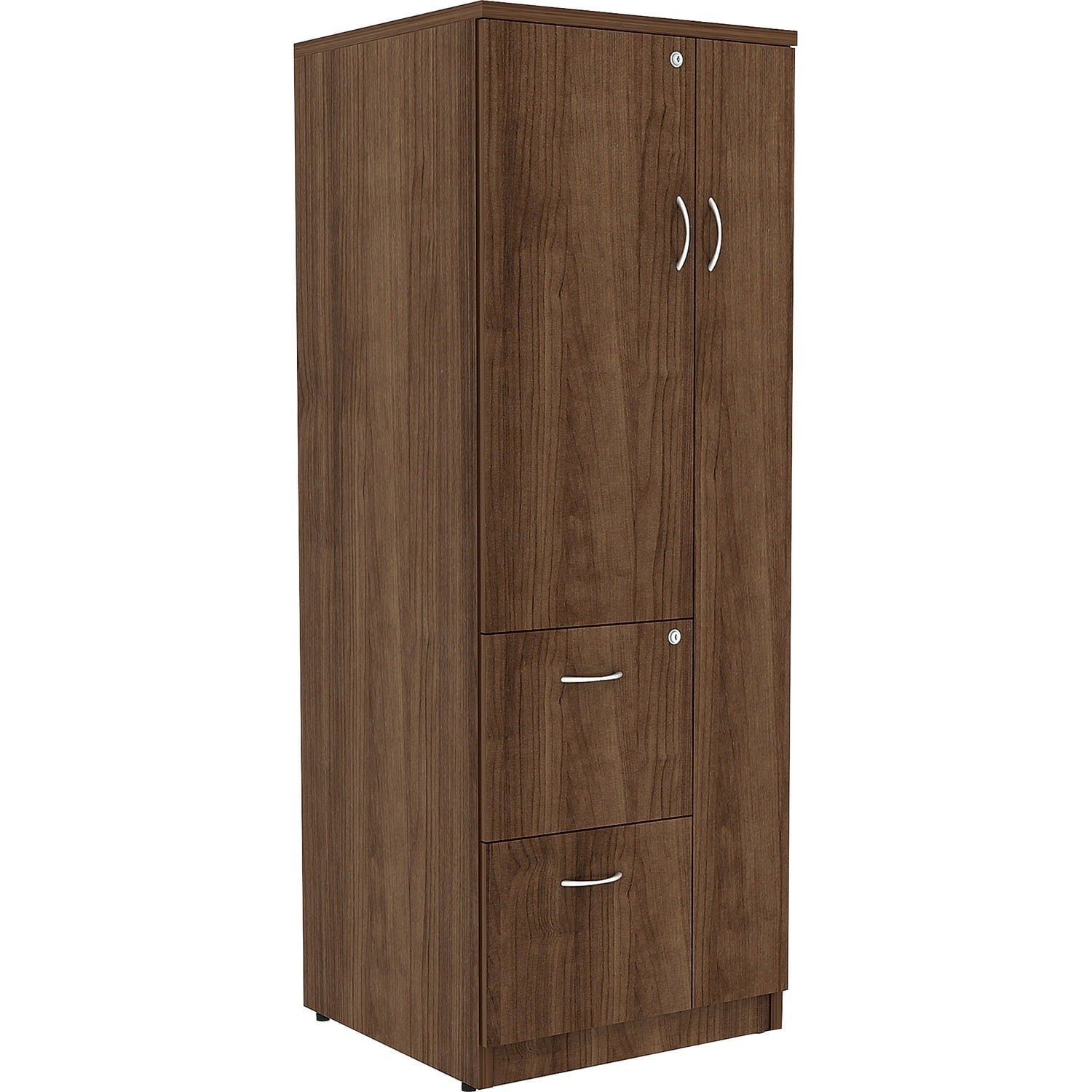 Tall storage cabinet is part of Lorell Essentials Series Laminate Furniture with high-quality laminate construction and metal-to-metal, cam-lock connections. Design of the cabinet expands your storage opportunities with the varied sizes of compartments. Full-length compartment on the right features a door to conceal contents. On the left, the half-length compartment includes a locking door and two shelves. The bottom two drawers lock to secure your belongings and hold letter-size files. Durable, Walnut laminate surfaces provide a professional look and are abrasion-resistant. The back is finished on both sides. Cabinet is made of particleboard and medium-density fiberboard. Adjustable levelers help stabilize the cabinet on uneven surfaces. More from the Manufacturer