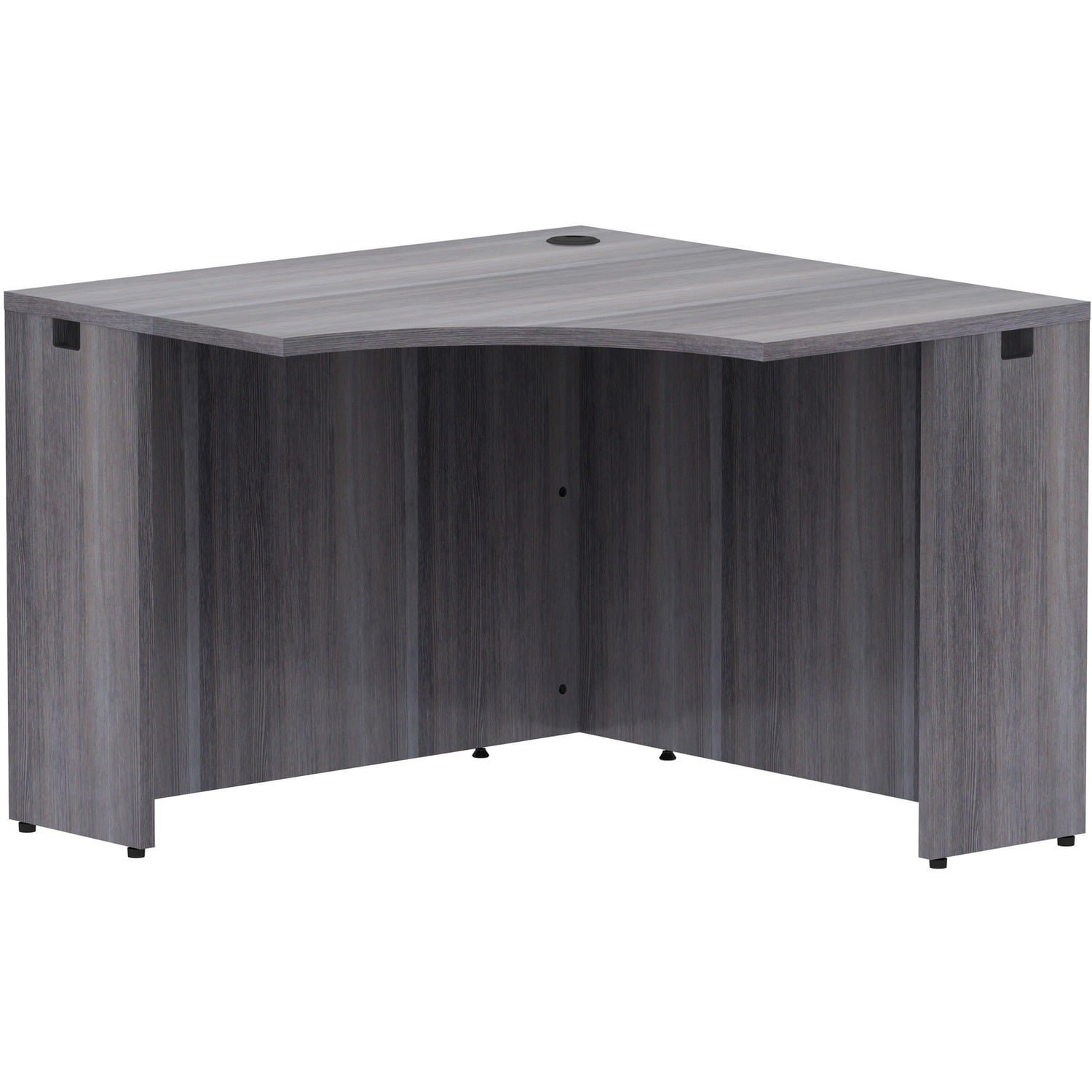 Corner desk is part of Lorell Essentials Series Laminate Furniture with high-quality laminate construction and metal-to-metal, cam-lock connections. Weathered Charcoal laminate top is 1″ thick for durability. Use the grommet hole in the top for easy cord routing. Design also includes a full modesty panel for privacy, 3mm PVC edges and adjustable feet.
