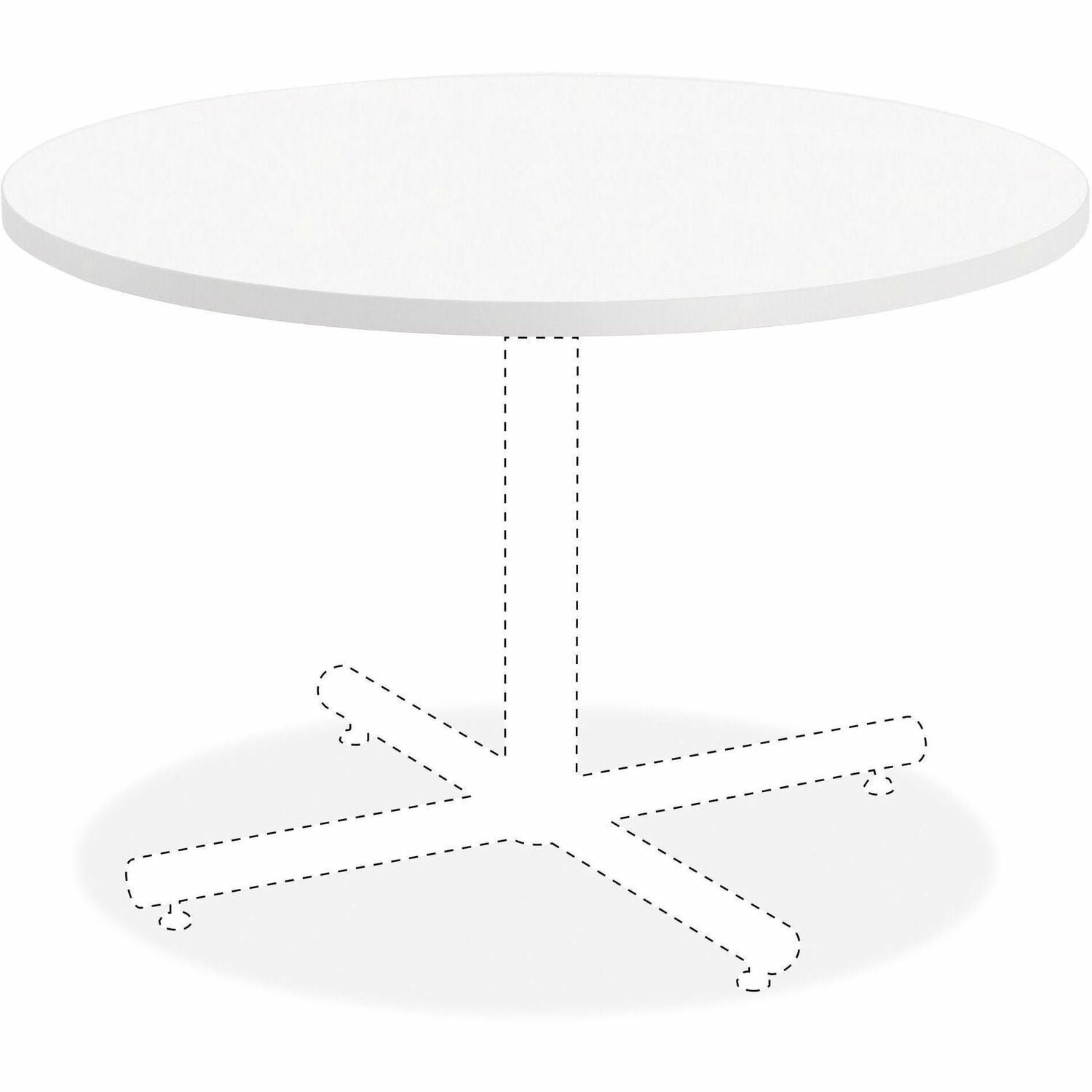 As part of the Lorell Hospitality Table Collection, this round tabletop is ideal for cafeterias or breakrooms. 1-1/4″ thick top is made with high-pressure laminate for an inviting place to meet or snack. Durable, stain-resistant, scratch-resistant laminate is thermofused on the top and bottom to 45 lb. density particleboard core. Design features a matching white, vinyl T-mold edge. Tabletop also includes a pre-drilled hole for easy mounting of the X-leg base (sold separately).