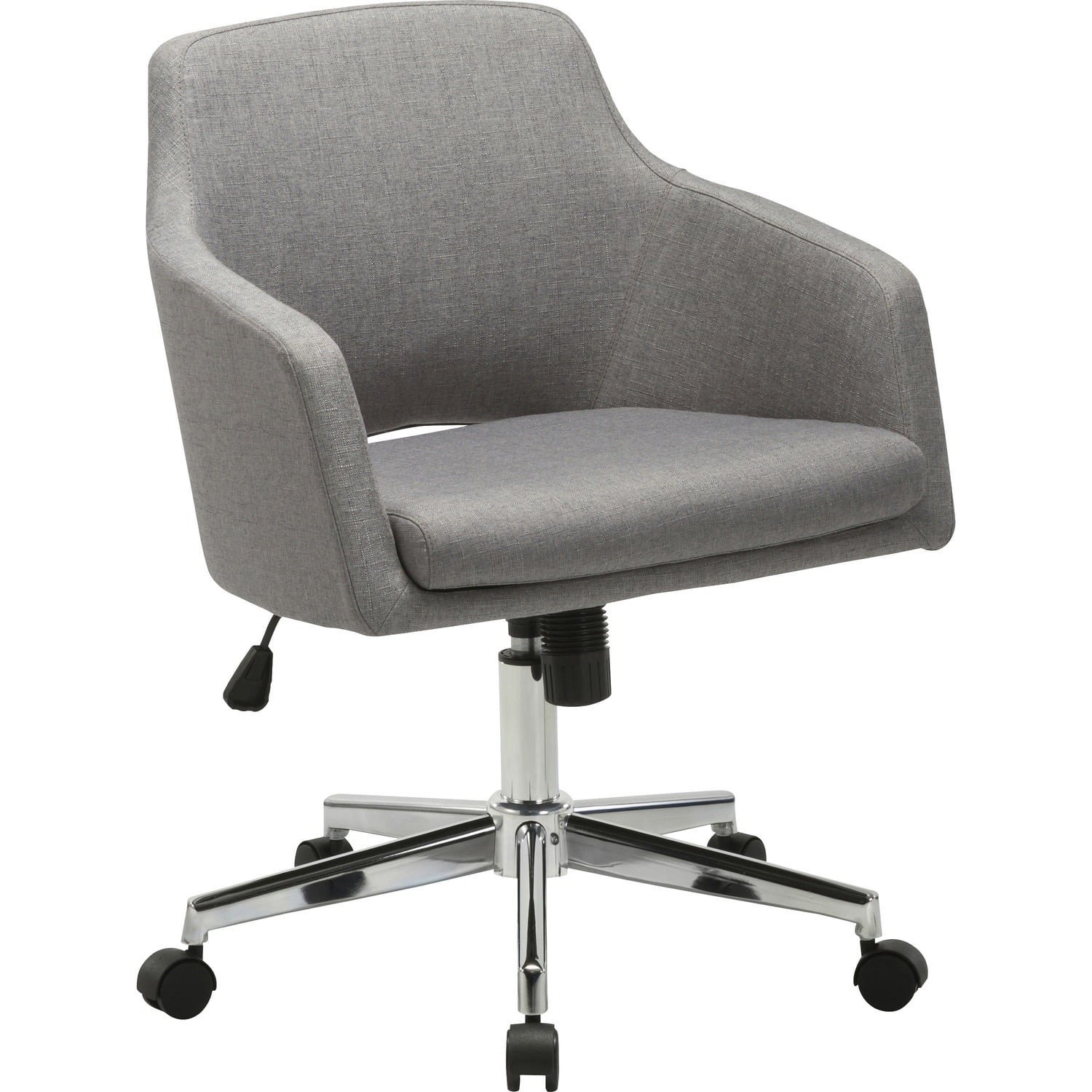 Mid-century modern-inspired task chair with low-profile arms is upholstered with stylish gray fabric for a professional look. Seat, back and arms are cushioned for comfort. Simple design features 360-degree swivel and seat-height adjustment. Chair adjusts in height from 31-7/8″ to 34-7/8″. Five-star chrome base is equipped with smooth-rolling casters. More from the Manufacturer