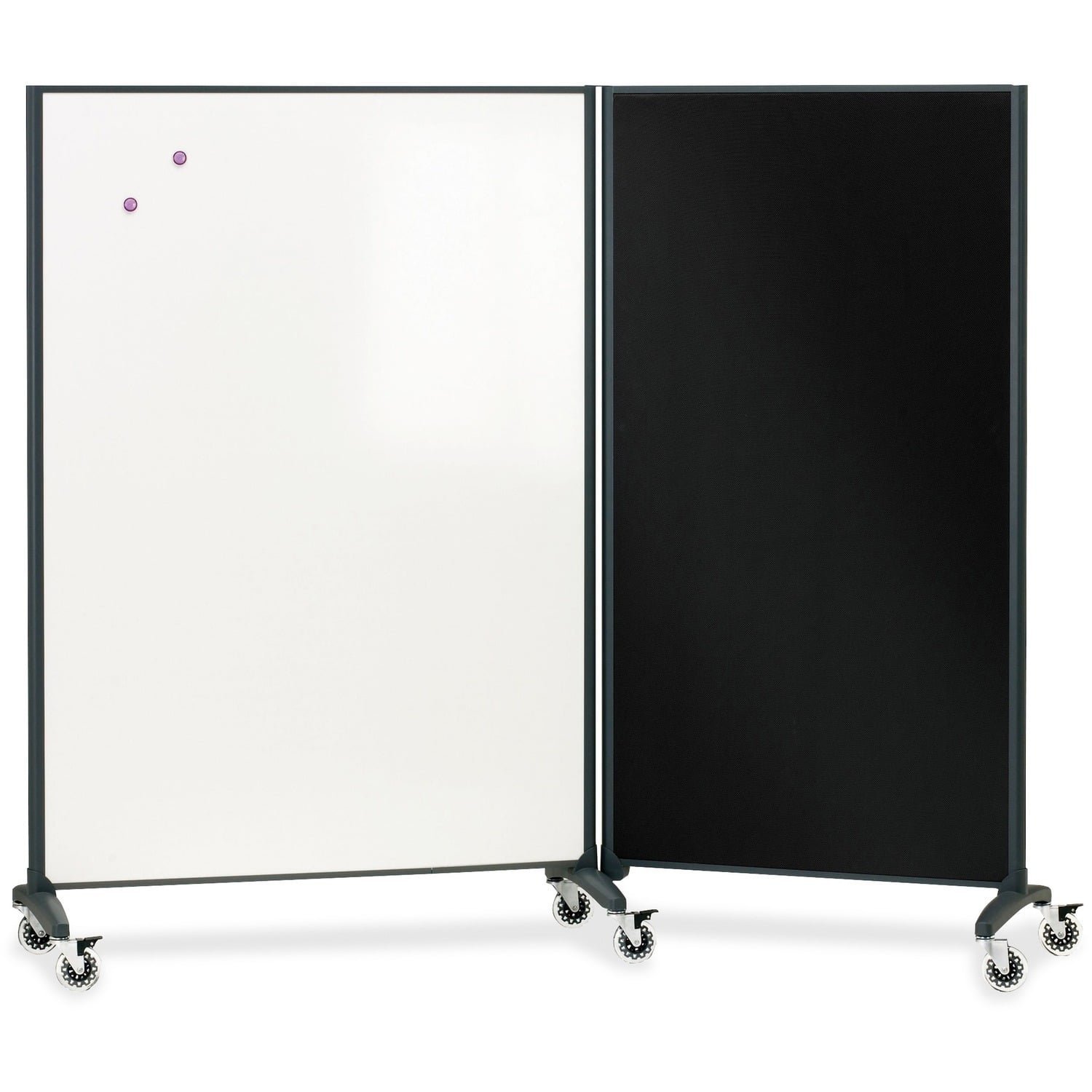 Two-sided rolling room divider features a premium porcelain magnetic whiteboard with flip chart pad holders on one side and fabric-covered bulletin board. Perfect tool for presentations and meetings. Durable fabric bulletin surface allows you to display items. String boards together to act as a room divider. Boards nest together for storage. Design offers a graphite metal frame, sleek narrow footprint and easy mobility with four wheels. Room divider includes four Quartet markers, eraser and attachable magnetic marker tray.