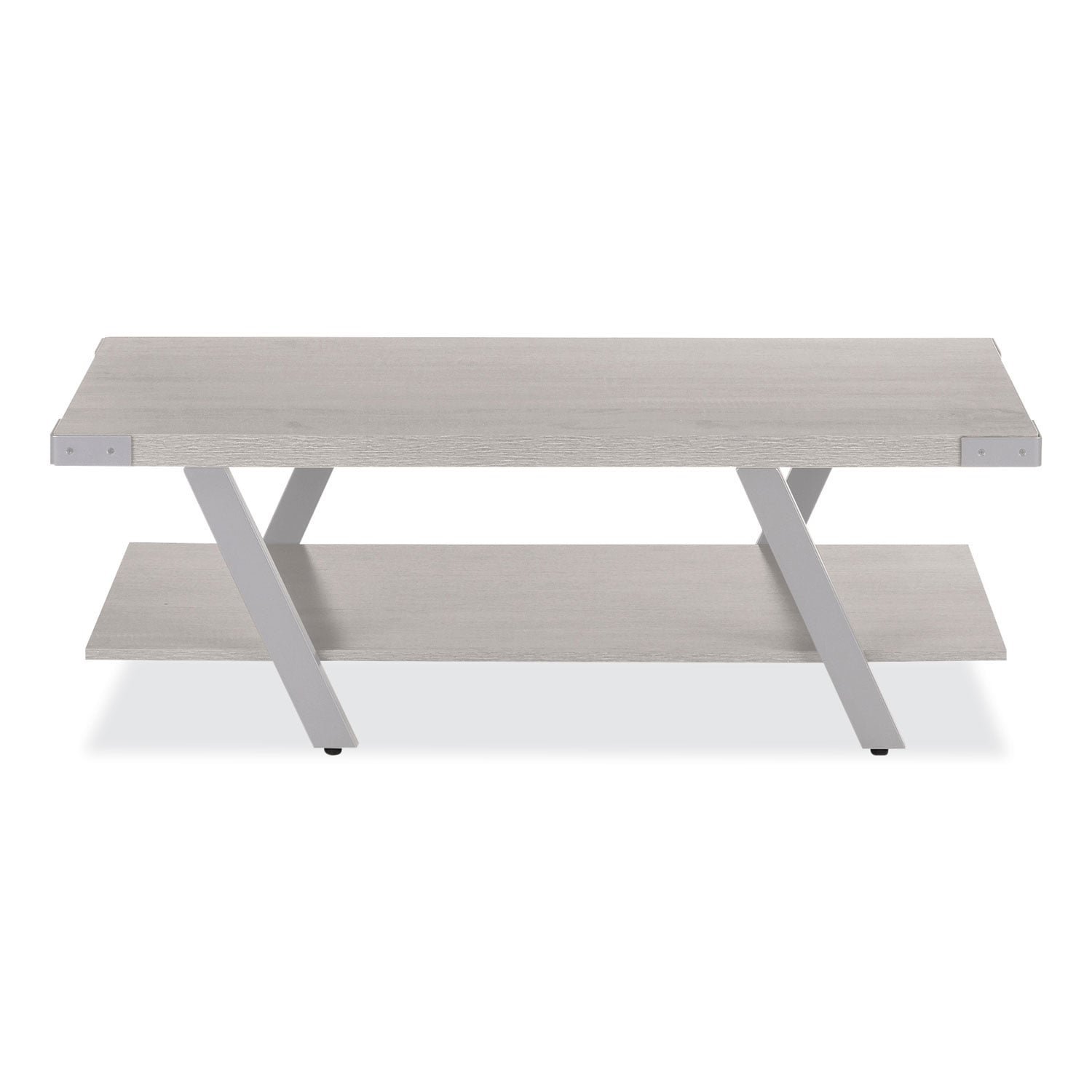 Mirella Coffee Table features a contemporary design with slanted metal legs for a one-of-a-kind look. The unit comes complete with a bottom shelf for storage. Coordinates with Mirella Conference and Reception designs for a cohesive and professional look. Top Color: White Ash; Color Family: Gray; Base Color: Silver; Top Shape: Rectangular.