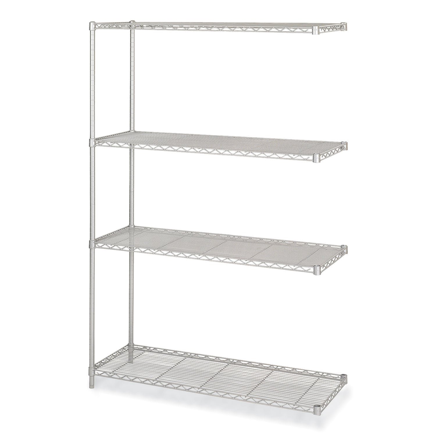 The Industrial Add-On Unit is a heavy-duty storage solution designed to expand your existing shelving system with extra-strength welded wire construction for maximum durability and support. Ideal for office storage, warehouses and commercial spaces, its open wire design allows for better air circulation, helping to keep stored items fresh while minimizing dust accumulation. The adjustable wire shelves, which move in 1-inch increments, provide a customizable setup to accommodate a variety of storage needs, from bulky equipment to smaller office supplies. This unit includes four sturdy steel shelves, four durable posts and easy-to-use snap-together clips, making assembly fast and hassle-free. Whether you’re optimizing your workspace or creating an organized storage area, the Industrial Add-On Unit delivers strength, functionality and efficiency in a sleek, professional design. Series Name: Safco Industrial Wire Shelving; Shelf Type(s): Adjustable; Shelf Depth: 18″; Shelf Capacity (Weight): 1,000 lbs.