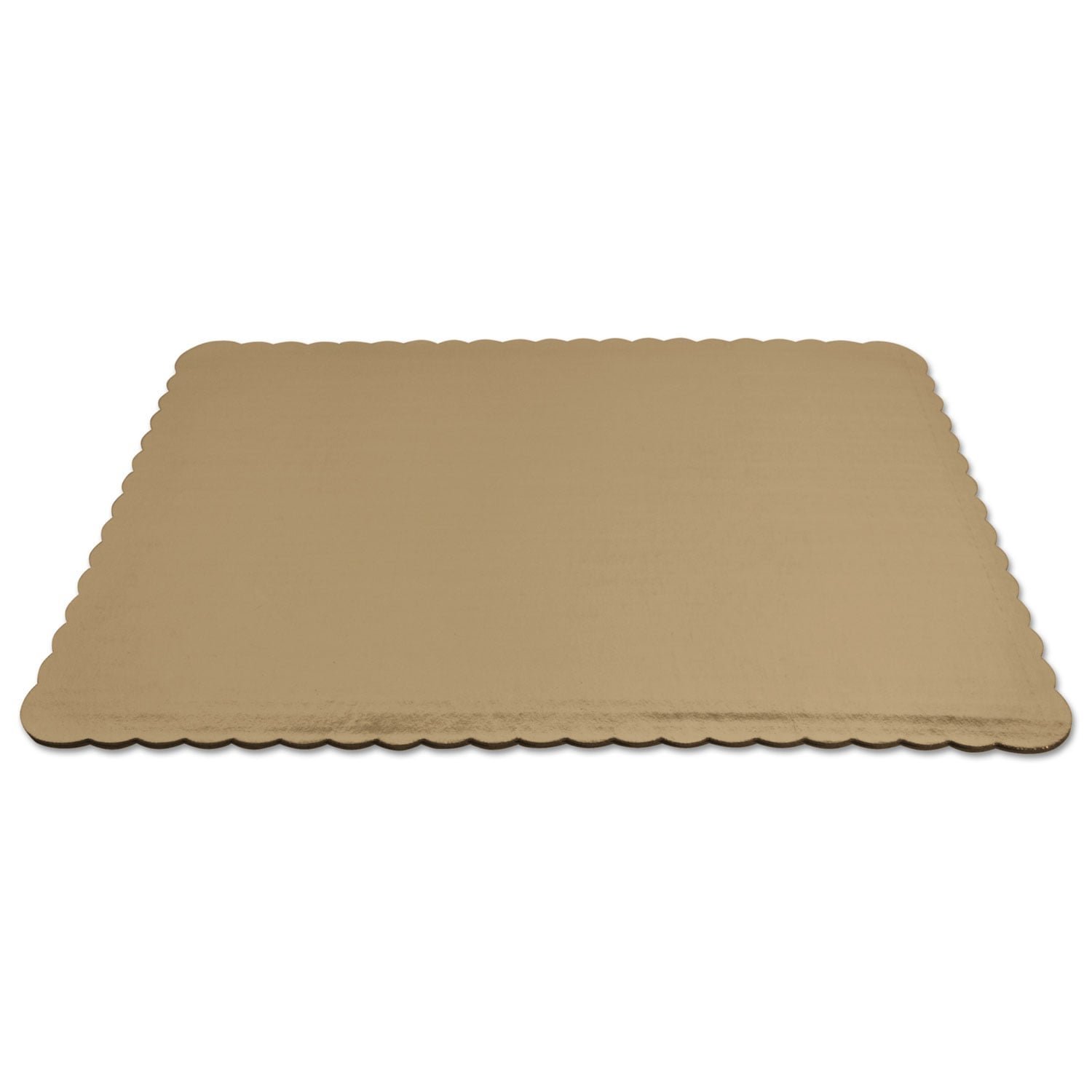 Sturdy cake pads are made from strong fluted corrugated material. Mylar coating provides moisture and grease barrier. Attractive, scalloped edge and bright color give a clean, professional presentation of decorated cakes. 1/2 Sheet Cake Pad. Food Container Type: Cake Pad; Material(s): Mylar; Paperboard; Material Type: Paper; Color(s): Gold.