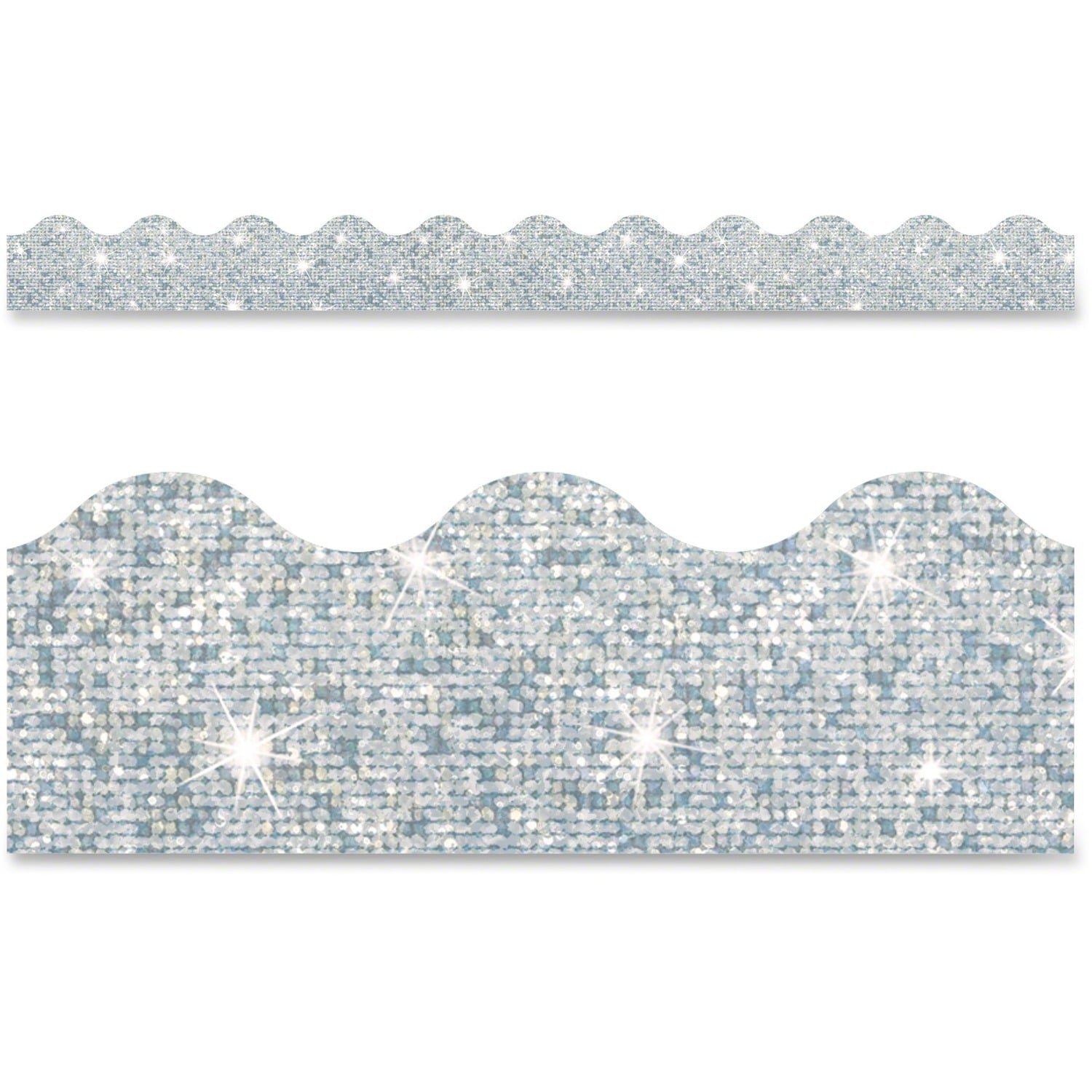 Layer patterns on solids, sparkles, or metallics; or use as-is to showcase student work in style, make funky crowns and bookmarks, and engage and delight. The perfect finishing touch for whiteboards, reward charts, calendars or any display. Durable and reusable. Silver Sparkle. 2-1/4″ x 39′.