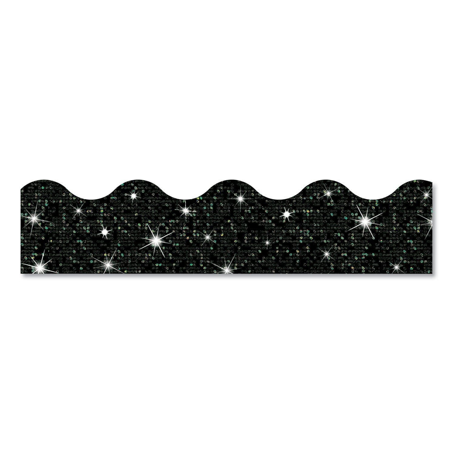 Sparkling trims decorate classrooms and enhance learning environments. Pre-cut, scalloped borders add a touch of dazzling color. Durable trimmers are reusable. Coordinate with Sparkle Ready Letters, sold separately, to complete the theme. Theme: Sparkles; Color(s): Black Sparkle; Color Family: Black.