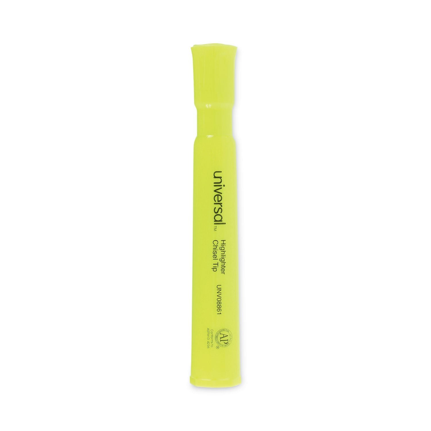 Universal Desk Highlighters are well-designed highlighting pens that feature bright, vibrant colors. The chisel tip allows for both broad and narrow lines. Large cap holds firmly on either end of the highlighter so it doesnt get lost. The bright ink stands out on the page, dries quickly, and will not fade. Highlighter Style: Round Tank; Highlighter Ink Color: Fluorescent Yellow; Color Family: Yellow; Highlighter Tip Type: Chisel.